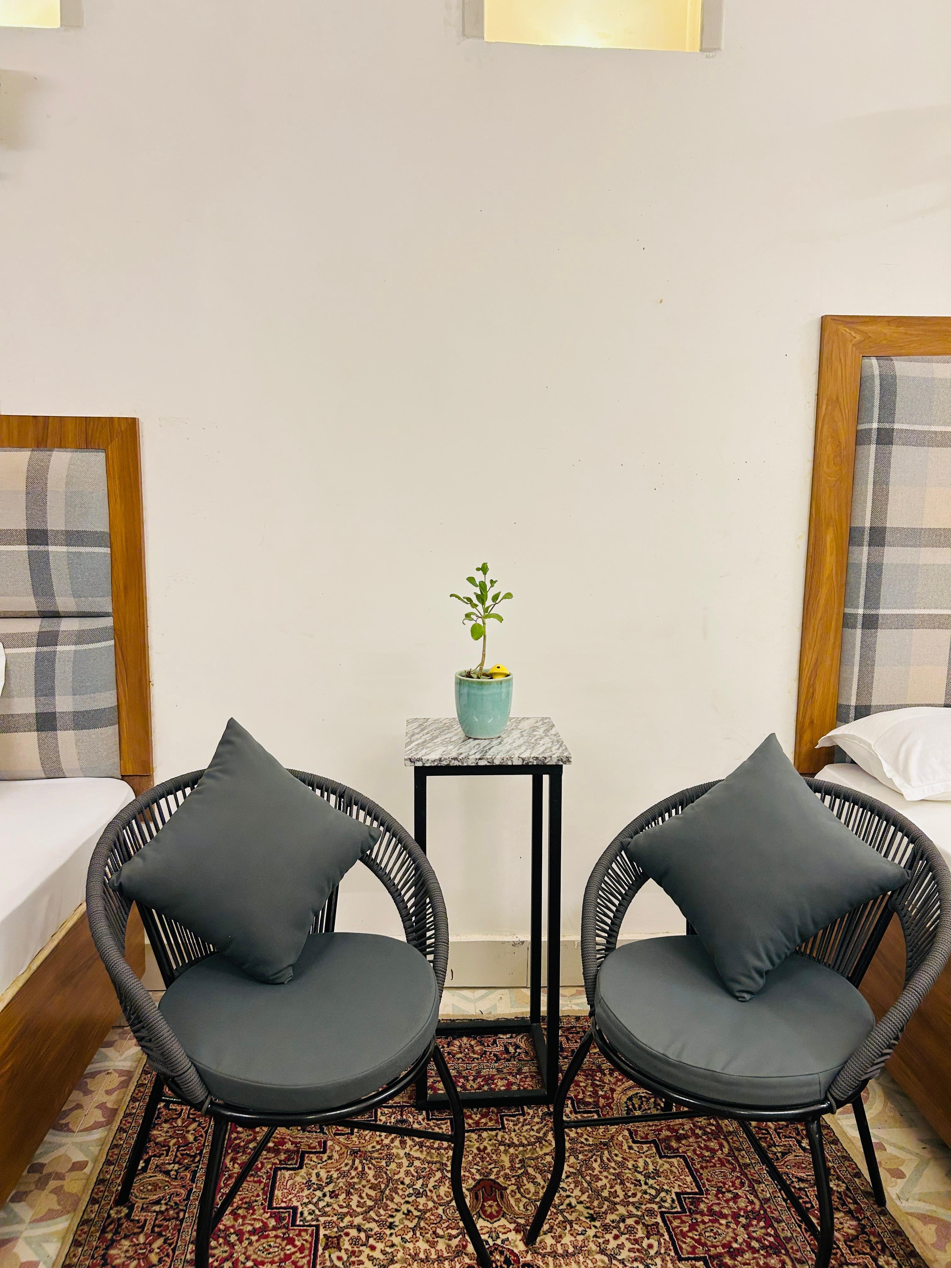 Authentic Rajasthani Decor – Hand-painted walls, antique wooden furniture, and royal paintings